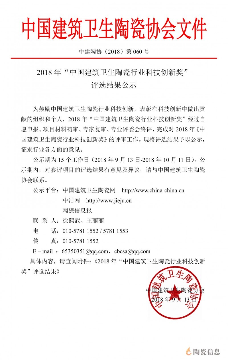 2018年“中国建筑卫生陶瓷行业科技创新奖”评选结果公示
